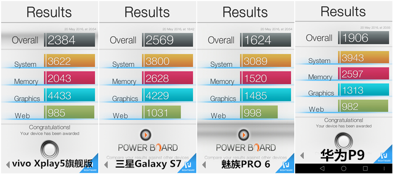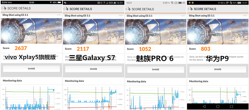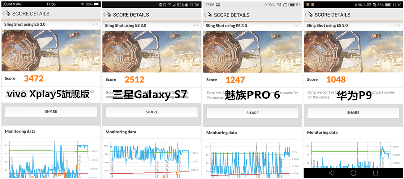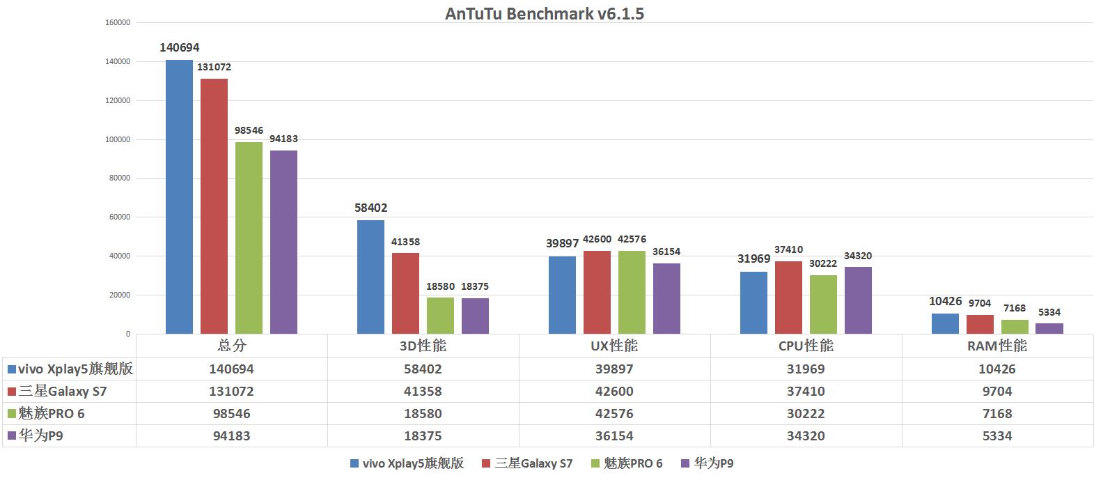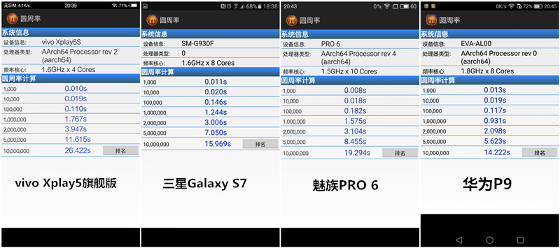 性能測試結果:vivo Xplay5旗艦版>三星Galaxy S7>魅族PRO 6> 華為P9
