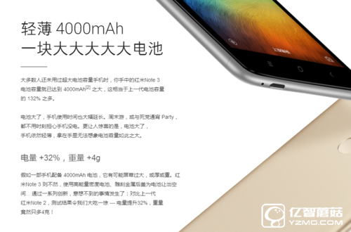 紅米Note 3同樣是一臺續航神器,從目前來看,除了最新的小米Max這個bug級存在外,該機是整個小米手機家族中當之無愧的續航NO.1。它內置了一塊4050mAh容量(典型值)電池,加上優化成熟的MIUI,都讓它用起來電力十足。