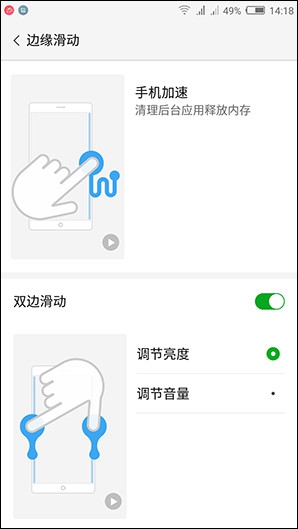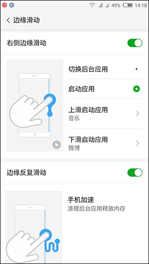 至于大家熟悉的努比亞“邊緣手勢”功能,nubia Z11 mini也得到了保留。它支持左側(cè)邊緣滑動(dòng)、右側(cè)邊緣滑動(dòng)、邊緣反復(fù)滑動(dòng)以及雙邊滑動(dòng)四種操作方式。能實(shí)現(xiàn)切換后臺(tái)應(yīng)用、啟動(dòng)應(yīng)用、手動(dòng)加速等功能或操作。事實(shí)上,用戶還可以手動(dòng)調(diào)整其觸發(fā)功能,從而最大化的發(fā)揮“邊緣手勢”的優(yōu)勢。
