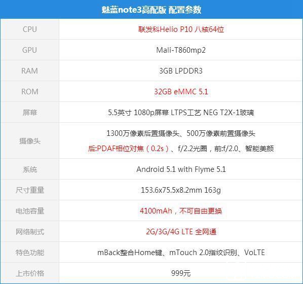 魅藍(lán)note3高配版作為一部千元機(jī),機(jī)身硬件都采用的是品牌旗艦所采用的硬件,那么我們先用一張圖來(lái)看看魅藍(lán)note3的配置