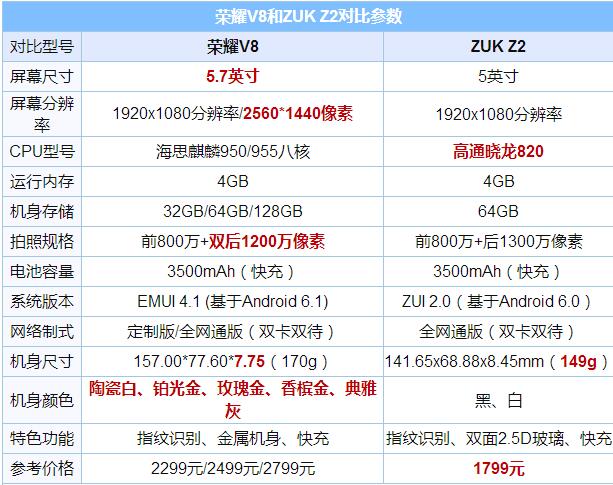 小編還是按照一貫的風格,先來看看ZUK Z2和榮耀V8硬件配置參數對比情況,如下圖所示。