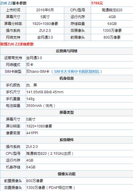 通過下面顯示的詳細參數,我們可以對ZUK Z2各個細節方面有全面了解,喜歡這款機型的朋友,不妨初步了解一下。