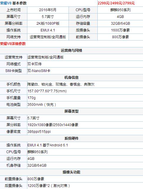 榮耀V8基本參數