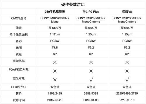 360手機旗艦版、華為P9 Plus和榮耀V8是三臺采用了雙攝像頭設(shè)計的手機,三臺手機在發(fā)布時間上跨度有九個月之久。