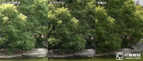 360手機旗艦版得益于自己的f/1.8大光圈,背景的虛化能力上要比華為P9 Plus和榮耀V8好上不少,而華為P9 Plus和榮耀V8實在是看不出有什么區(qū)別,非要摳的話,也只能說華為P9 Plus在背景樹林部分比榮耀V8好了那么一丁點。