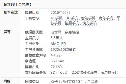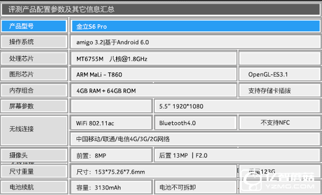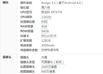 金立S6 Pro的基本參數:其擁有一塊5.5英寸1920*1080分辨率屏幕,內置聯發科MT6755M八核處理器,最高主頻1.8GHz,配備4GB RAM+64GB ROM。拍照方面是前置800萬像素+后置1300萬像素的組合,預裝基于Android 6.0系統的amigo 3.2,電池容量3130毫安時。