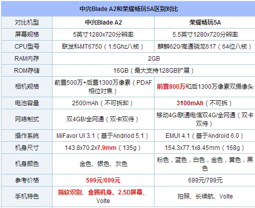 榮耀暢玩5A和中興BladeA2配置參數性能對比評測