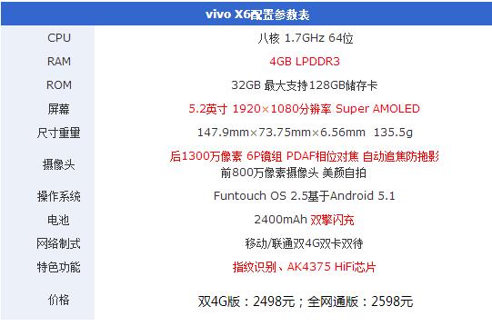 vivo X6擁有一塊5.2英寸的屏幕,分辨率為19201080,搭載一顆八核處理器,4GB RAM+32GB ROM,后置1300萬/前置800萬像素?cái)z像頭,內(nèi)置2400mAh電池,支持“雙擎閃充”、指紋識別,運(yùn)行基于Android 5.1的Funtouch OS系統(tǒng)。