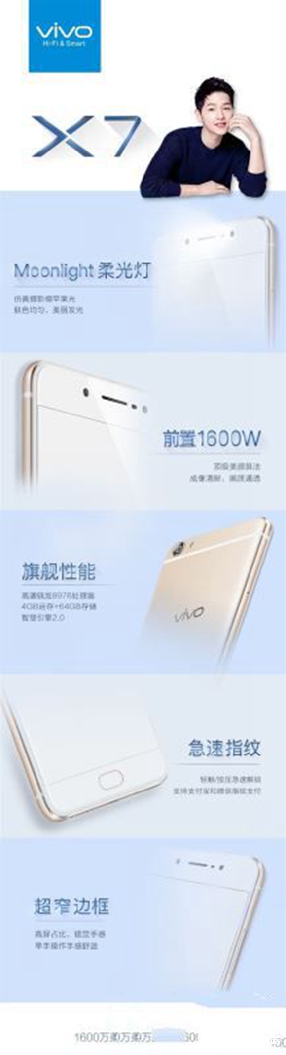 vivoX7將搭載高通驍龍8976處理器(驍龍652),4GB+64GB存儲組合,同時還有全新第二代智慧引擎調(diào)度硬件軟件資源分配,以及新加HiFi3.0,采用正面指紋識別。