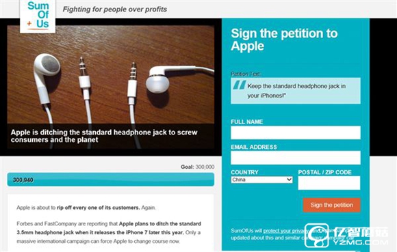 從今年1月份開始,就不斷有果粉在知名公益網(wǎng)站SumOfUs.org發(fā)起請愿書投票(請愿地址,你也可以投一票),反對蘋果保留3.5mm耳機(jī)接口。目前,請愿人數(shù)已經(jīng)超過30萬人,達(dá)成當(dāng)初的目標(biāo)。