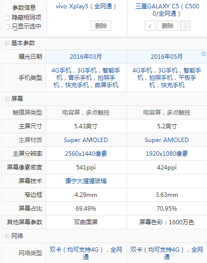 三星 C5和vivo xplay5配置參數詳細對比: