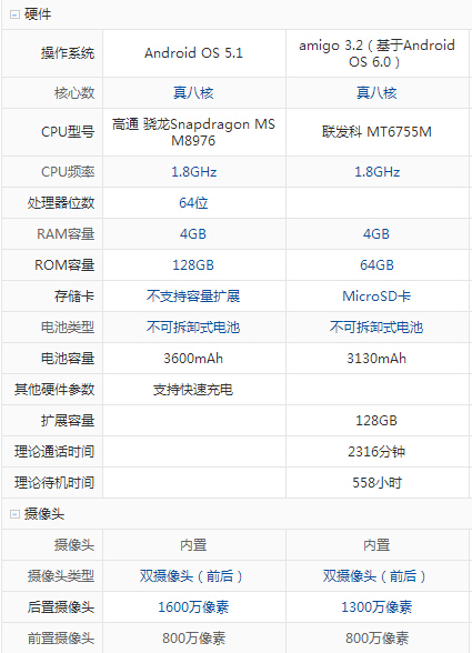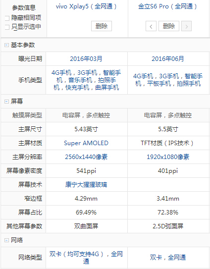 vivo Xplay5和金立 S6 Pro配置參數詳細對比: