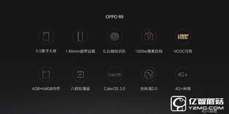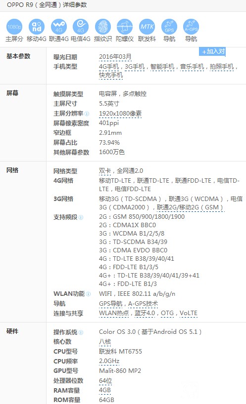 手機(jī)內(nèi)置聯(lián)發(fā)科Helio P10 MT6755 2.0GHz八核64位處理器,搭配4GB RAM,內(nèi)置64GB機(jī)身存儲空間,支持128GB microSD卡擴(kuò)展。作為一款全新的智能手機(jī),OPPO R9全網(wǎng)通 版本支持中國聯(lián)通、中國移動和中國電信的4G/3G/2G網(wǎng)絡(luò)。全新的全網(wǎng)通2.0,允許用戶任意將移動4G卡、聯(lián)通4G卡和電信4G卡搭配使用,任意一張卡都可選4G網(wǎng)絡(luò),另一張為2G網(wǎng)絡(luò)。