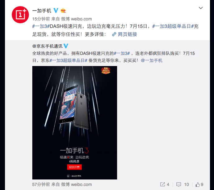 今天一加手機(jī)微博宣布,將聯(lián)手京東于7月15開展“一加3超級單品日”活動。同時(shí),有了一加3首次發(fā)售搶售一空的“前科”后,劉作虎表示一加3超級單品日將大量備貨,用戶可以放開買。