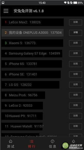 ▲用安兔兔跑分軟件測試,一加手機3的分數為137504分。