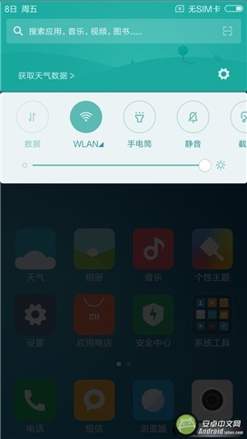 通知欄也有所改變,MIUI 8中不同模塊更為直觀的使用不同色調進行區分,快捷設置按鈕也增添了一種全新的排列形式,除了之前的列表模式,還有左右滑動的模式可供用戶選擇。