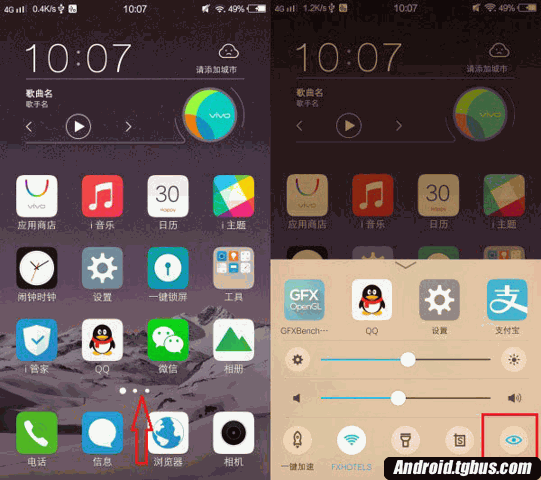 從vivo x7 Plus左面底部向上滑動(dòng)屏幕,這樣就可以引出底部快捷操作菜單,這樣【全局護(hù)眼】功能點(diǎn)擊即可開啟。