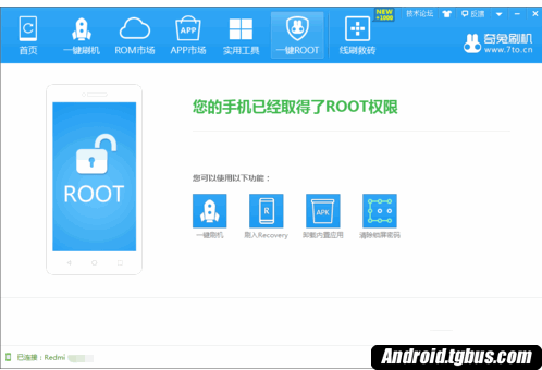 當刷機操作完成后,直接切換到“一鍵ROOT”選項卡,點擊“開始ROOT”按鈕,此工具將自動從云端下載ROOT方案,并自動完成紅米Pro手機的ROOT操作。