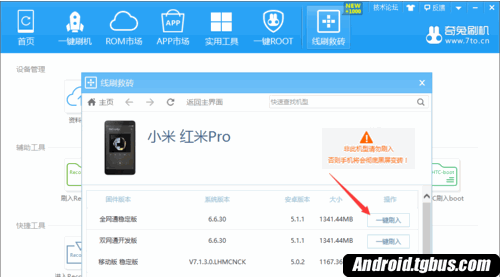 切換到“線刷救磚”選項卡,找到“紅米Pro”對應的線刷包,并在其詳情界面中點擊“一鍵刷入”按鈕,以便對紅米Pro進行修復救磚操作。
