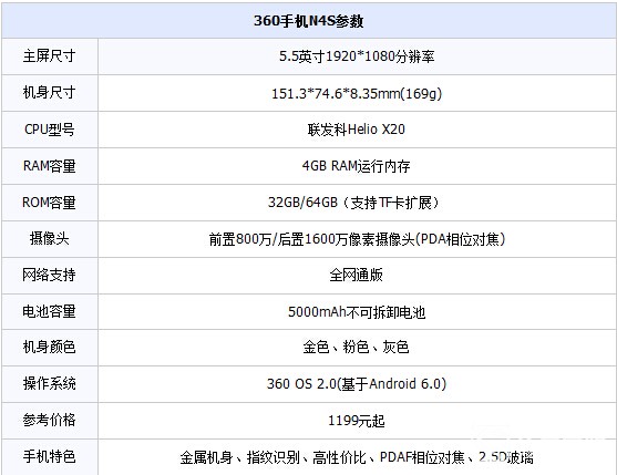 讓我們先來看看360N4S硬件配置參數,具體如下所示: