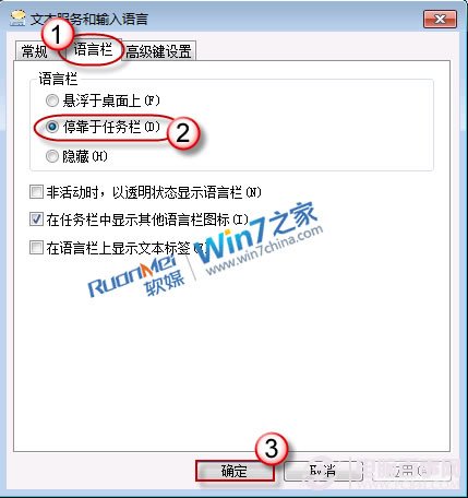 2、打開“語言欄”選項卡,點擊選中“停靠于任務欄”后按“確定”退出。