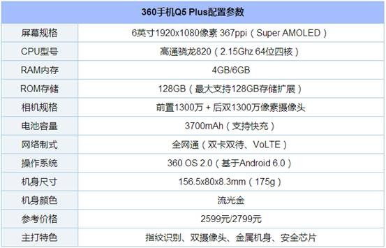 配置方面,360手機Q5 Plus采用了6英寸1080P全高清大屏,搭載高通驍龍820處理器,4GB運行內(nèi)存和128GB超大存儲空間,擁有前置1300萬和后置雙1300萬像素共三攝像頭,內(nèi)置3700mA容量電池(支持快充),以下是Q5 Plus詳細參數(shù)。
