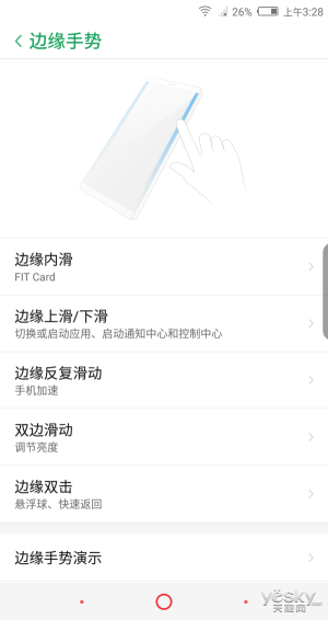 在設(shè)置菜單里可以找到“邊緣手勢”的選項,點開后里面有詳細的圖文教程如何使用FIT。把FiT打開以后,就可以快捷的實現(xiàn)啟動應(yīng)用、調(diào)節(jié)亮度、清理后臺、返回等操作,減少用機時間成本,對用戶而言是一種既方便又實用的用機方式。