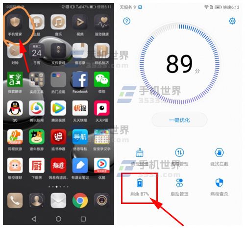1)打開【手機(jī)管家】,點(diǎn)擊【剩余電量的電池圖標(biāo)】;(如下圖)