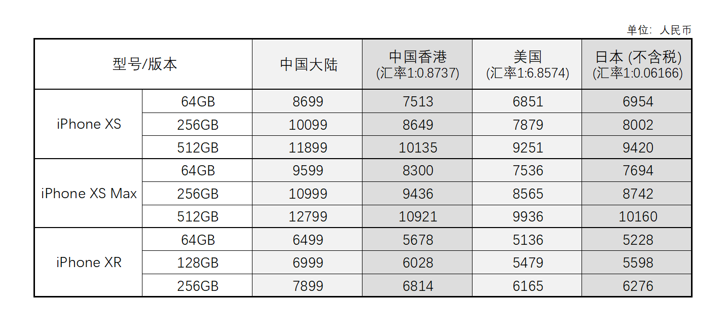 iPhone XS/XS Max和iPhone XR四大國家地區(qū)售價對比:中國大陸最貴