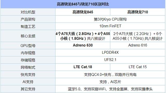 魅族16X搭載的是高通驍龍710處理器,而魅族16則為高通驍龍845,這兩款CPU都是基于10nm先進工藝,功耗都很低,主要是性能上的差異,以下是這兩款CPU規(guī)格參數(shù)對比。