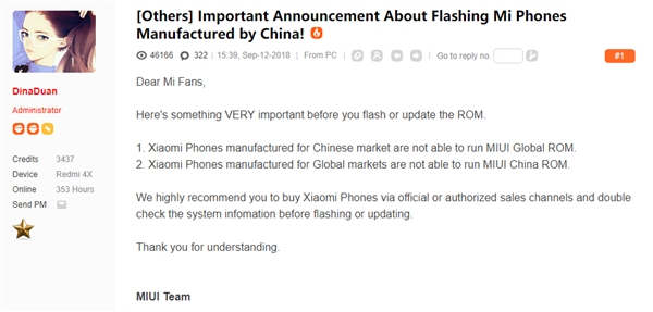 在早些年,一些用戶出于嘗鮮或者“去廣告”的想法,偏愛刷為國際版ROM,但新通知表示,中國區的手機將不再被允許運行MIUI國際版;同樣,國際版的產品也無法刷為行貨ROM。