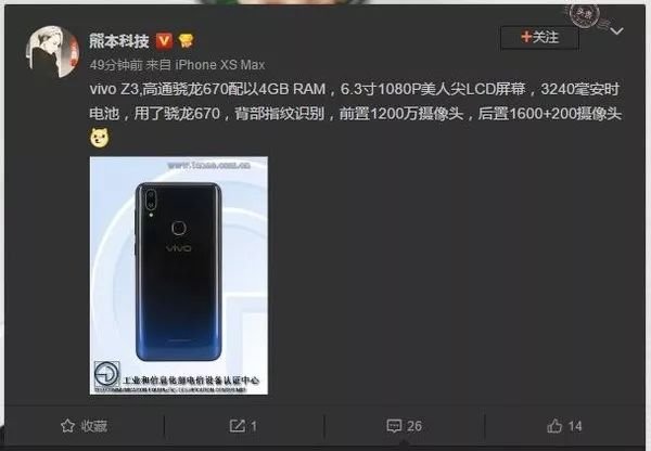 據微博網友@熊本科技透露,vivo Z3將搭載高通驍龍670處理器,配備4GB以上的運行內存,采用6.3寸1080P美人尖LCD屏幕,內置3240毫安時電池。前置1200萬像素攝像頭,后置1600萬+200萬像素攝像頭,工信部圖片顯示該機為背部指紋識別。