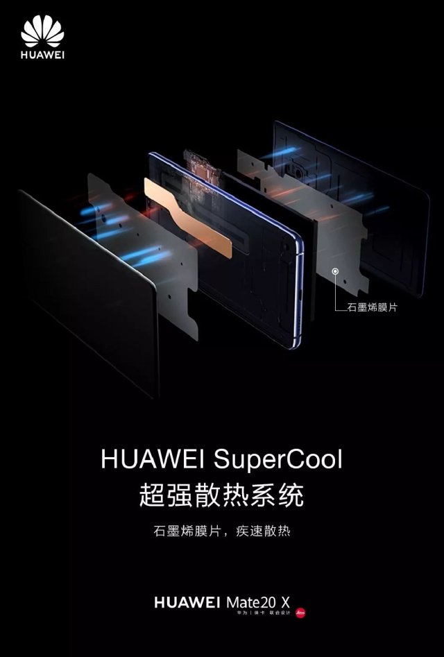 此外,HUAWEI Mate 20 X整機散熱上大面積使用石墨烯材料, 石墨烯的散熱能力是普通鋁合金的4倍。