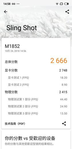 對于GPU性能的進一步測試,我們使用專業圖形性能測試軟件3DMark的Android版進行測試,在“Sling Shot”跑分中,魅族X8跑出了2666分的成績。在移動設備中,處于第二梯隊,超過了82%的所有其他設備,這個成績意味著魅族X8能夠在中高畫質下流暢運行流行的的大型3D手游。