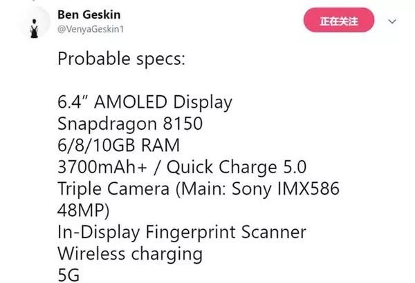 內(nèi)置3700mAh電池,支持QC 5.0快充,后置4800萬像素三攝,主攝為索尼IMX586傳感器。此外,該機還加入屏幕指紋技術,支持無線充電和5G網(wǎng)絡。