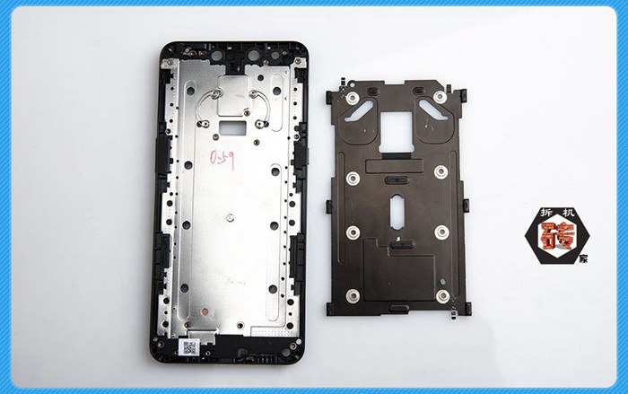 完全打開后可見滑蓋總程是由2塊金屬板組成的,其中一塊(黑色)為屏幕活動板,采用8枚螺絲和屏幕連接,通過6個卡腳固定位置防止橫向晃動,同時8個螺絲位采用同心圓突出設計,對應底部金屬板的開槽位置,在滑動時起到很好的導向作用,控制滑動的方向,確保滑動的時直上直下而不會出現偏差。