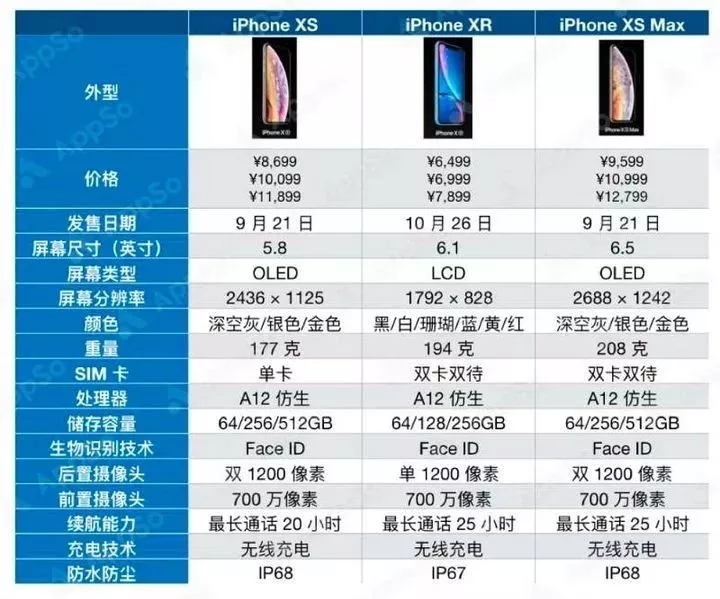 首先,我們來了解一下iPhoneXR和已經開售的iPhoneXS、iPhoneXS Max的區別,具體如下圖: