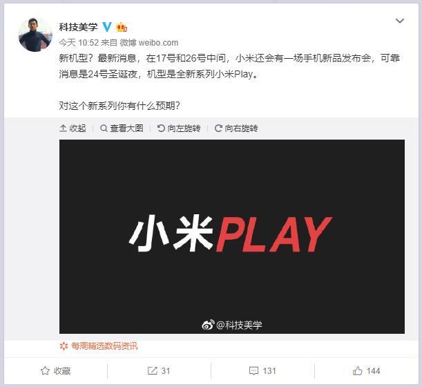 今天,博主@科技美學(xué) 給出了一個(gè)信息,稱小米將在24號(hào)圣誕夜當(dāng)天有一場發(fā)布會(huì),而這次的新品是小米的全新系列小米Play。也就是說,小米將在今年底推出一個(gè)全新的系列,考慮到林斌此前的自曝,小米Play應(yīng)該就是這個(gè)4800萬的小米新機(jī)。