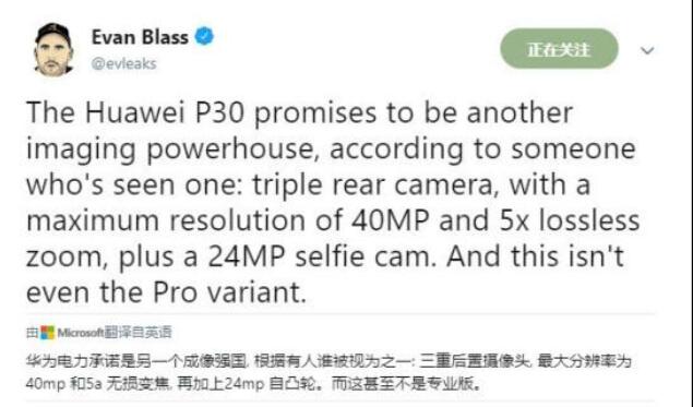 華為P30手機曝光:超強后置三攝 支持五倍無損變焦