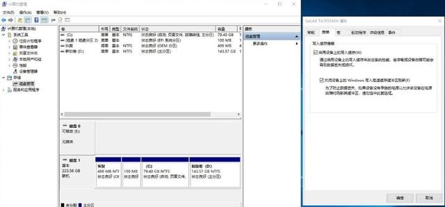 以Win10系統為例,右擊“此電腦”選擇“管理”,點擊“磁盤管理”,在所示紅框位置右擊選擇“屬性”,再點擊“策略”,勾選“關閉設備上的Windows寫入高速緩存緩沖區刷新”。
