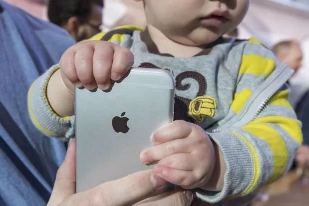 2015年的加州帕洛阿爾托,蘋果專賣店里的一名幼兒手中攥著一部新iPhone。