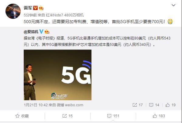 國產5G手機要比4G貴500元 雷軍:首批至少貴700 華為:呵呵