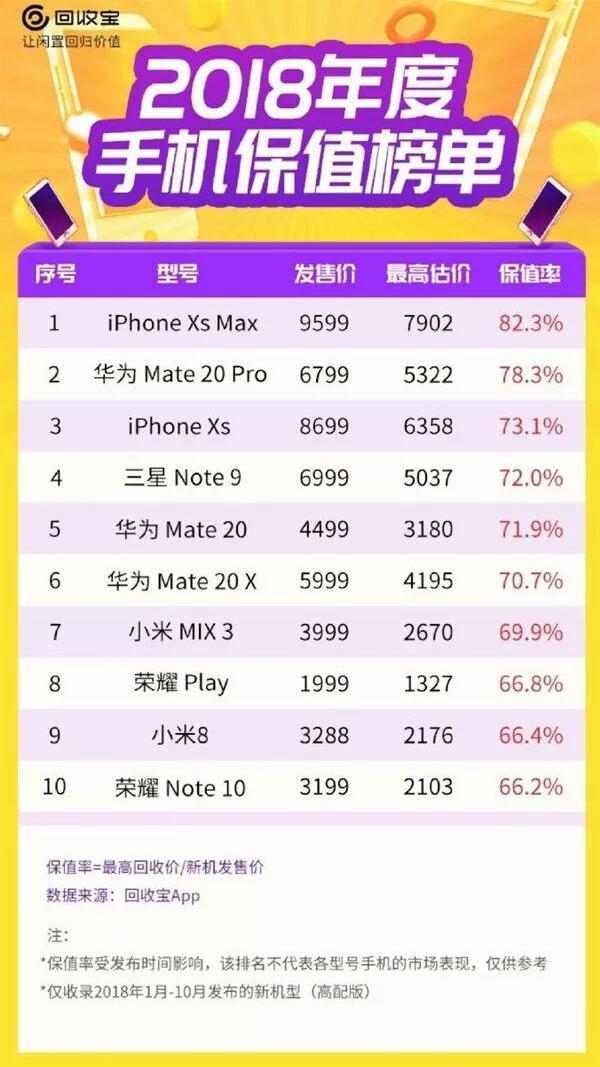 前十名的榜單是,第四名的是三星Note9。華為Mate20和華為Mate20 X分列五、六名。保值率為71.9%、70.7%。小米手機中,小米MIX3,小米8排名第七、第九名。保值率為69.9%、66.4%。第八和第十被榮耀Play和榮耀Note10承包了。保值率分別是66.8%和66.2%。