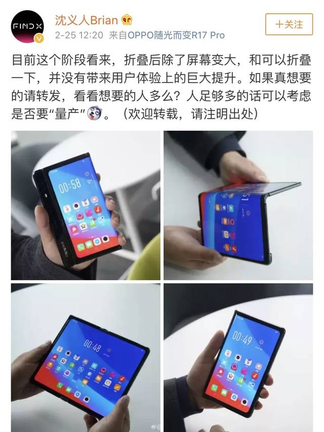 另外一家國(guó)產(chǎn)手機(jī)廠商OPPO,最近也展示了自家的新款折疊屏概念手機(jī)。不過并不是在展會(huì)上,而是副總裁沈義人通過微博蹭了個(gè)折疊屏的熱點(diǎn)。
