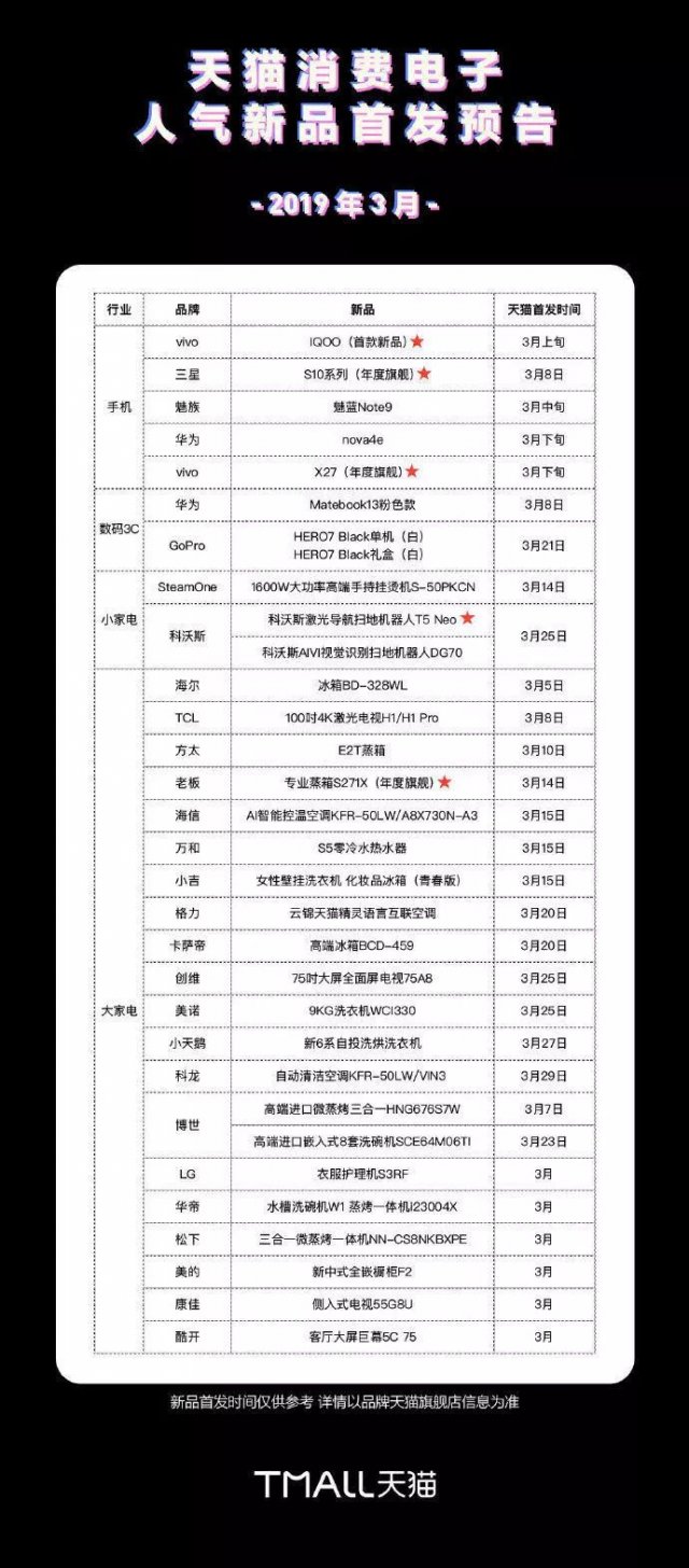近日,天貓發言人官微放出一份3月份新品發布預告海報,在手機分類中,預計在3月份發布的新機有iQOO、三星S10系列、魅藍Note 9、華為nova 4e和vivo X27。