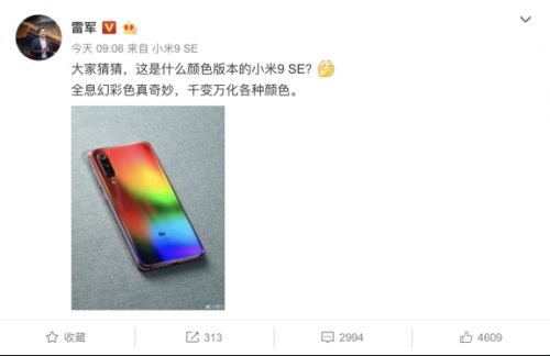 3月2日,小米總裁&創始人&CEO雷軍在微博放出了一臺小米9 SE的真機圖片,有所不同的是,這款小米9 SE采用了背板彩虹色的設計。手機在特定角度下會呈現出不同的色彩,紅橙黃綠青藍紫七種顏色由漸變效果統一,外觀非常酷炫。