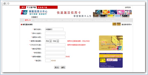 而針對“銀聯信用卡”的釣魚詐騙網站則以“快速激活”的幌子套取用戶的重要個人信息(如下圖)。