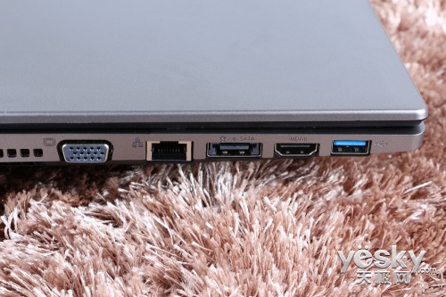 雷神G150S在這點上十分厚道,筆記本左側為電源接口、VGA視頻接口、RJ-45網絡接口、e-SATA接口、HDMI接口與一枚USB3.0接口。值得一提的是,e-SATA可以當做USB3.0接口使用。右側為USB3.0接口、USB2.0接口和3.5mm耳機MAC接口。