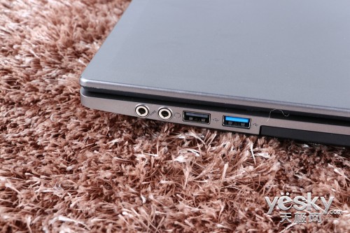 筆記本背板為工程塑料材質粗磨砂風格,這種設計能夠增加筆記本背板的散熱面積,而且在抓握時能夠提供足夠阻尼,是失手掉落的風險大大降低,十分實用。左側上下兩扇大面積進氣口可為這臺筆記本提供足夠的進風量,使散熱更加出色。