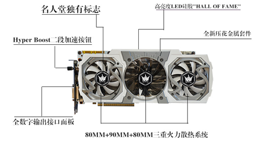 電競口碑之作顯卡――影馳GTX980名人堂,名人堂獨有標志、Hyper Boost二段加速按鈕、高亮度LED硅膠“HALL OF FAME”、全新壓花金屬套機、全數字輸出接口面板、80MM+90MM+80MM三重火力散熱系統,全面開放核心電壓,穩定超頻快感,職業戰隊OMG推薦,為電競而生!